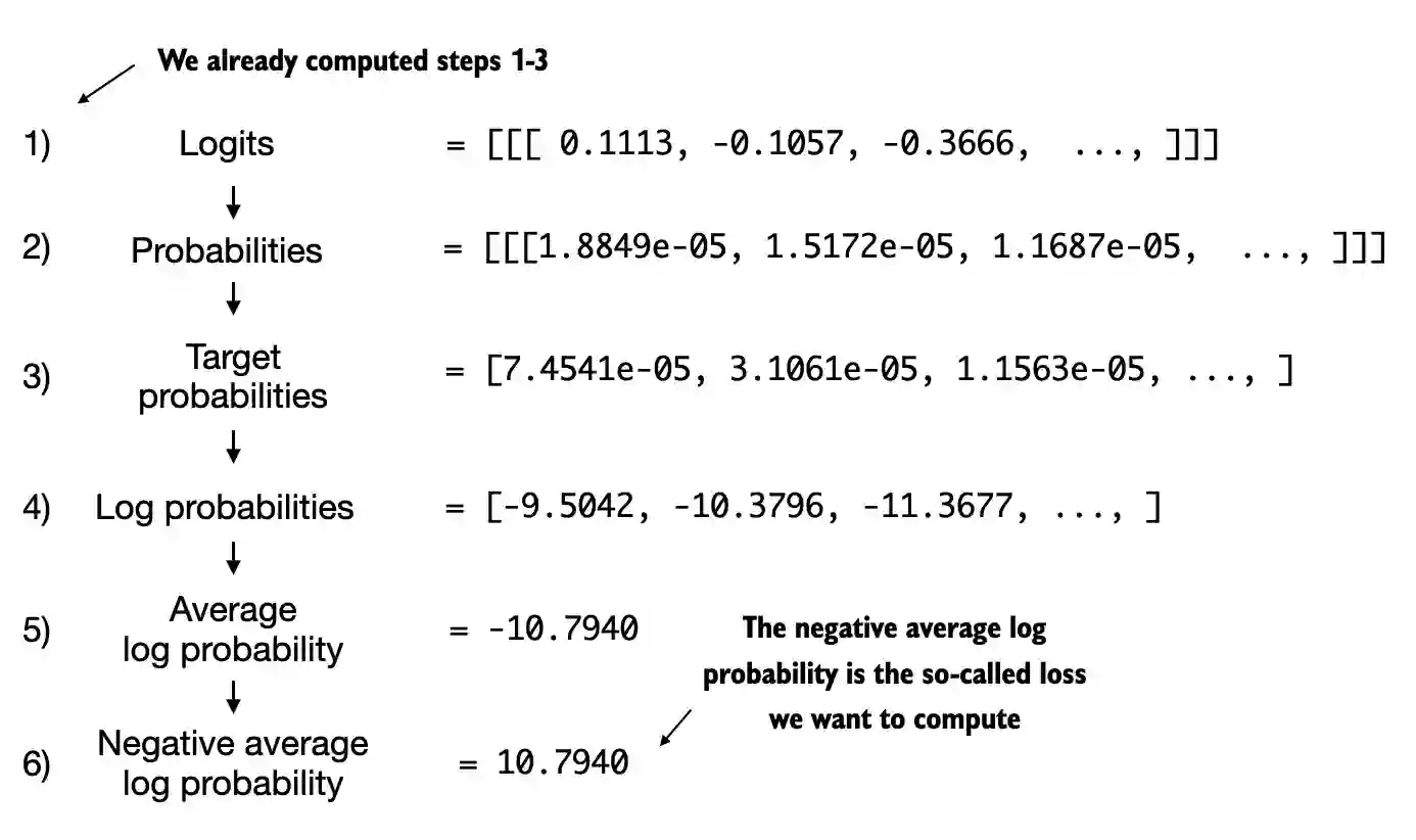 然后,对于每个上下文长度为5个标记的条目,例如,模型需要预测5个标记,前4个标记是输入的最后一个,第五个是预测的标记。因此,在这种情况下,对于每个条目我们将有5个预测(即使前4个在输入中,模型并不知道这一点),因此有5个预期标记,因此有5个概率需要最大化。