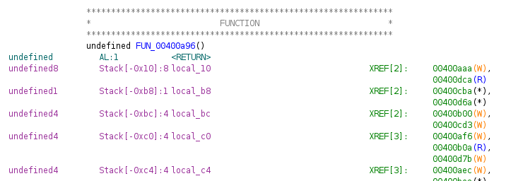 例如,在下面的示例中,local_bc 中的缓冲区溢出表明您需要 0xbc 的偏移量。此外,如果 local_10 是一个金丝雀 cookie,则表明要从 local_bc 覆盖它需要 0xac 的偏移量。