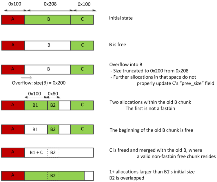 - 3个内存块(a、b、c)依次保留。然后释放中间的一个。第一个块包含一个越界溢出漏洞,攻击者利用它写入0x00(如果前一个字节是0x10,它将使中间块指示它比实际小0x10)。