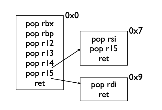 - 第一个序列让我们可以在多个寄存器(rbx, rbp, r12, r13, r14, r15)中设置值。这些就像我们可以存储数字或地址的槽位,以便稍后使用。