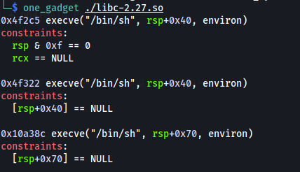 One Gadget 允许获取一个 shell,而不是使用 system 和 "/bin/sh"。One Gadget 将在 libc 库中找到一些方法来获取一个 shell (execve("/bin/sh")),只需一个 地址。