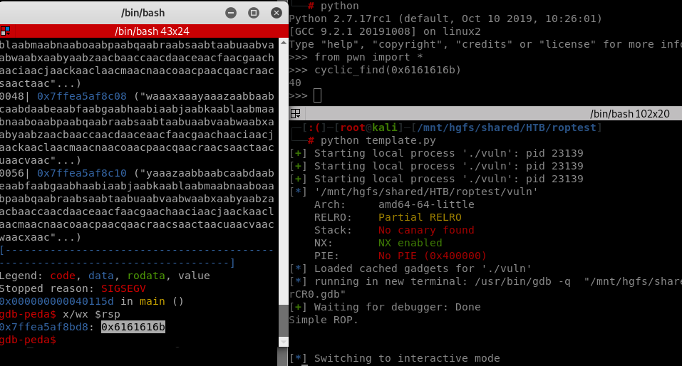 执行 python template.py 将打开一个 GDB 控制台,程序将崩溃。在该 GDB 控制台 中执行 x/wx $rsp 以获取将要覆盖 RIP 的 字节。最后使用 python 控制台获取 偏移量: