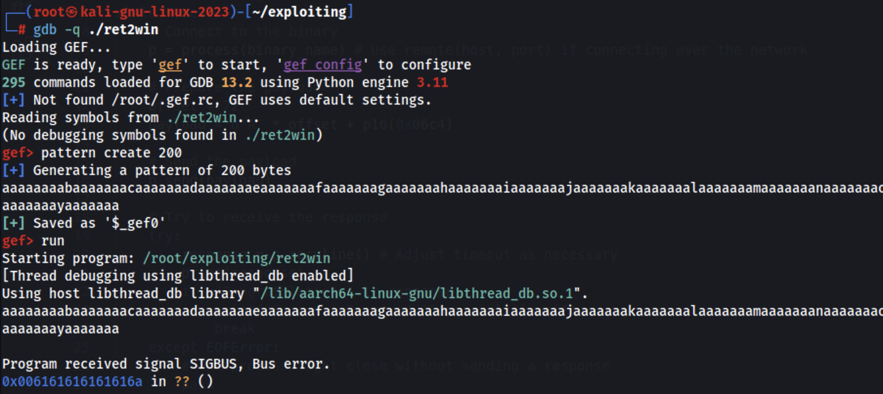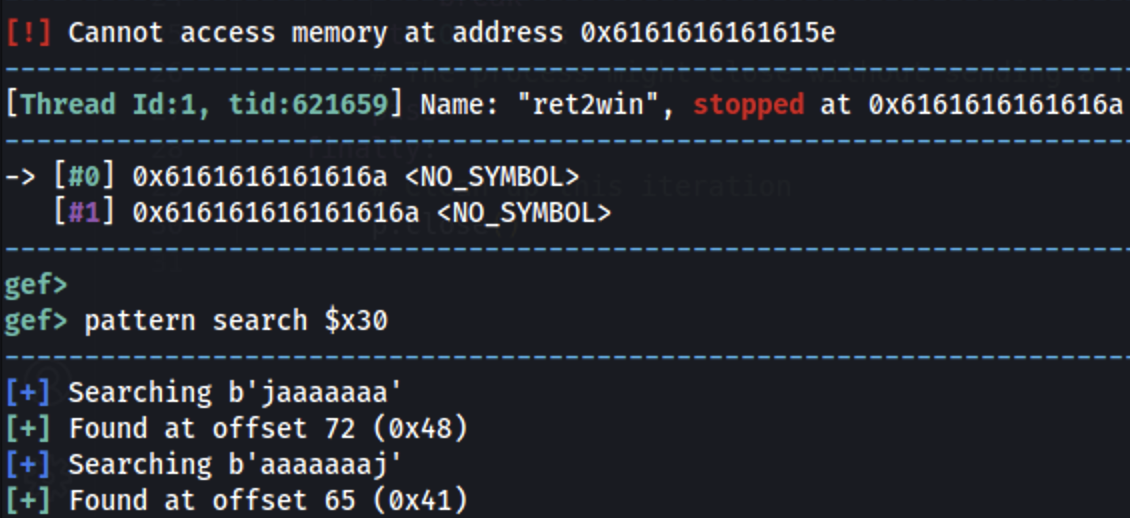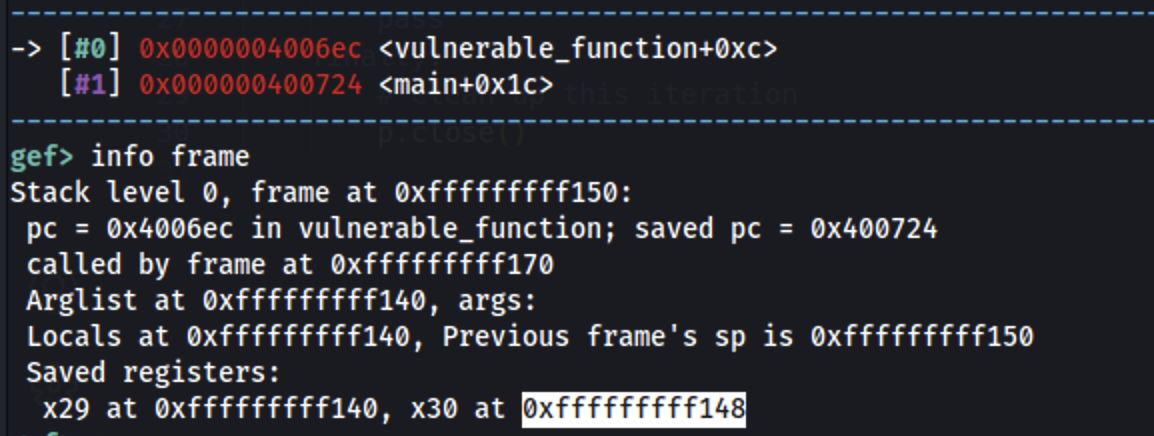 arm64 将尝试返回到寄存器 x30 中的地址(该地址已被破坏),我们可以利用这一点来找到模式偏移: