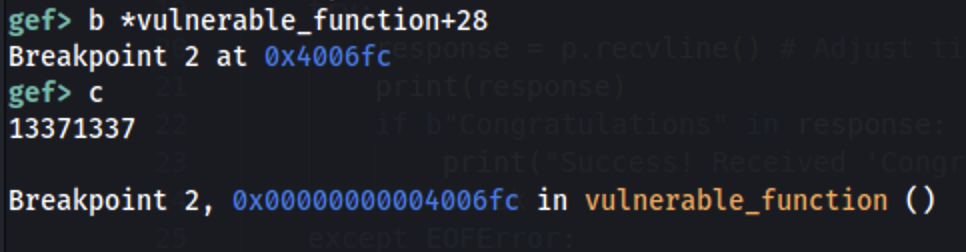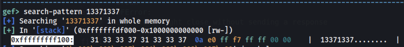 现在在 read() 之后设置一个断点,并继续直到 read() 被执行,并设置一个模式,例如 13371337: