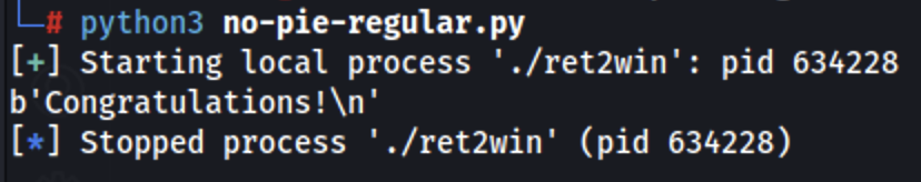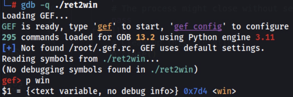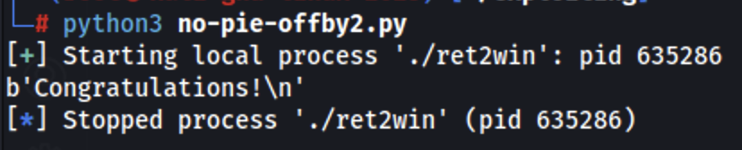 在没有泄漏的情况下,我们不知道获胜函数的确切地址,但我们可以知道该函数相对于二进制文件的偏移量,并且知道我们正在覆盖的返回地址已经指向一个接近的地址,因此可以泄漏到获胜函数的偏移量 (0x7d4) 并仅使用该偏移量: