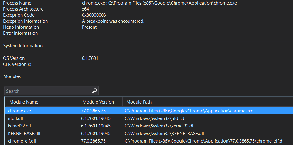 如果你安装了Visual Studio,你可以打开这个文件并绑定一些基本信息,如进程名称、架构、异常信息和正在执行的模块: