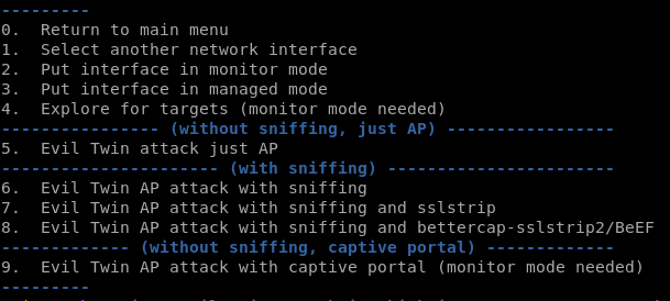 - 开放 恶意双胞胎 [+ DoS] -- 有助于捕获强制门户凭证和/或执行局域网攻击
