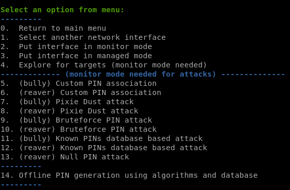 - 如果是 WPS:Pixie dust 攻击和暴力破解攻击(注意,暴力破解攻击可能需要很长时间)。请注意,它不会尝试空 PIN 或数据库/生成的 PIN。