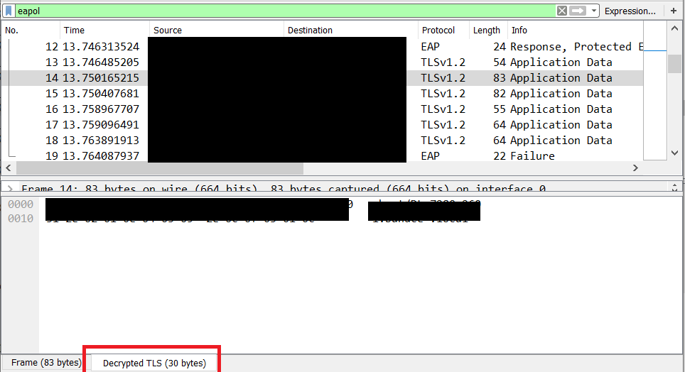 此方法在 PEAP 连接中进行了测试,但由于我正在解密任意 TLS 隧道,这也应该适用于 EAP-TTLS