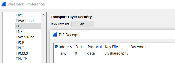 现在或稍后(当你已经捕获了一些认证意图时)可以在 Edit --> Preferences --> Protocols --> TLS --> (RSA keys list) Edit... 中将私有 RSA 密钥添加到 wireshark。