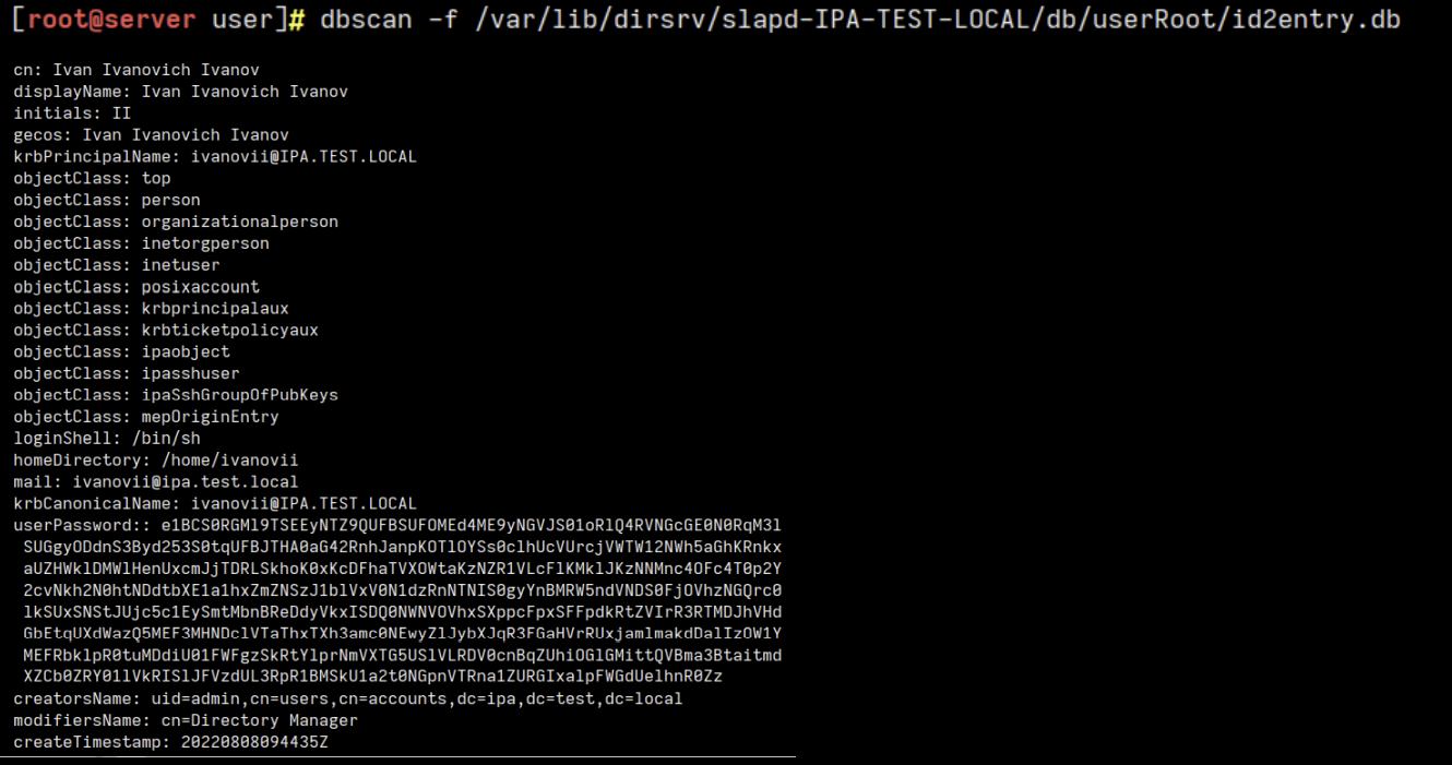 要提取 hashes,你需要在 FreeIPA server 中是 root,在那里你可以使用工具 dbscan 来提取它们: