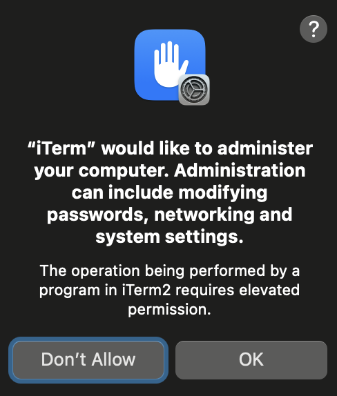 然而,请注意,您 需要是 root 才能写入该文件夹,而如今您会收到这个 TCC 提示: