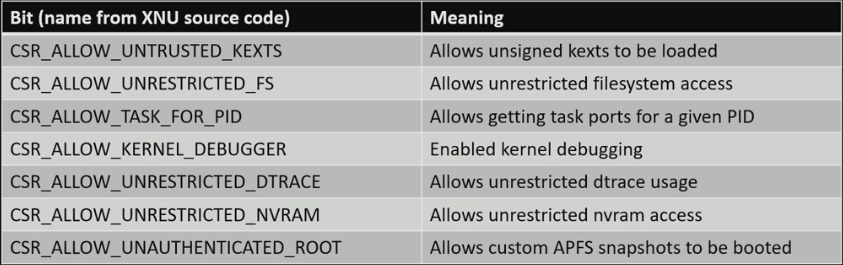 选项以位标志的形式保存在 nvram 变量中(在 Intel 上为 csr-active-config,在 ARM 上从启动的设备树中读取 lp-sip0)。您可以在 csr.sh 中找到这些标志: