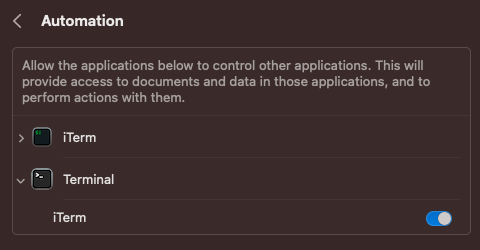 例如,如果一个应用对 iTerm 具有 自动化权限,例如在这个例子中 Terminal 对 iTerm 具有访问权限: