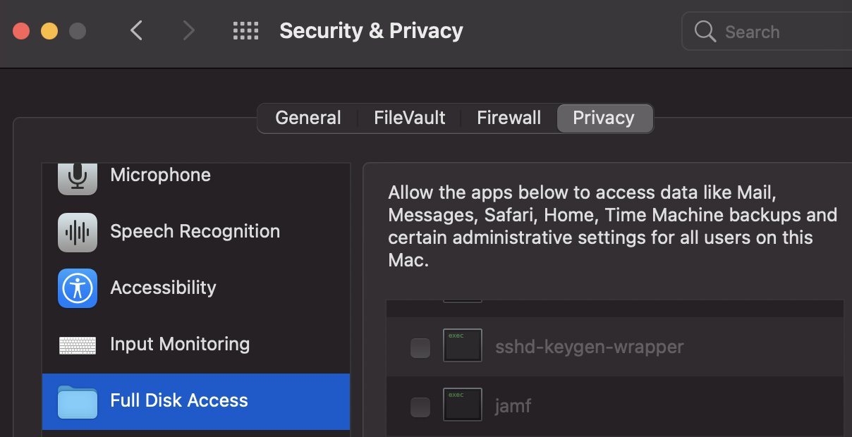 所需的唯一特权是用于访问的应用程序(如 Terminal)需要具有完全磁盘访问(FDA)权限(kTCCServiceSystemPolicyAllfiles),该权限需要由管理员授予。