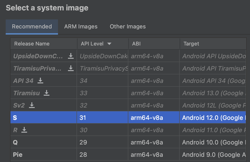 在当前视图中,您将能够 选择并下载 Android 镜像,该手机将运行: