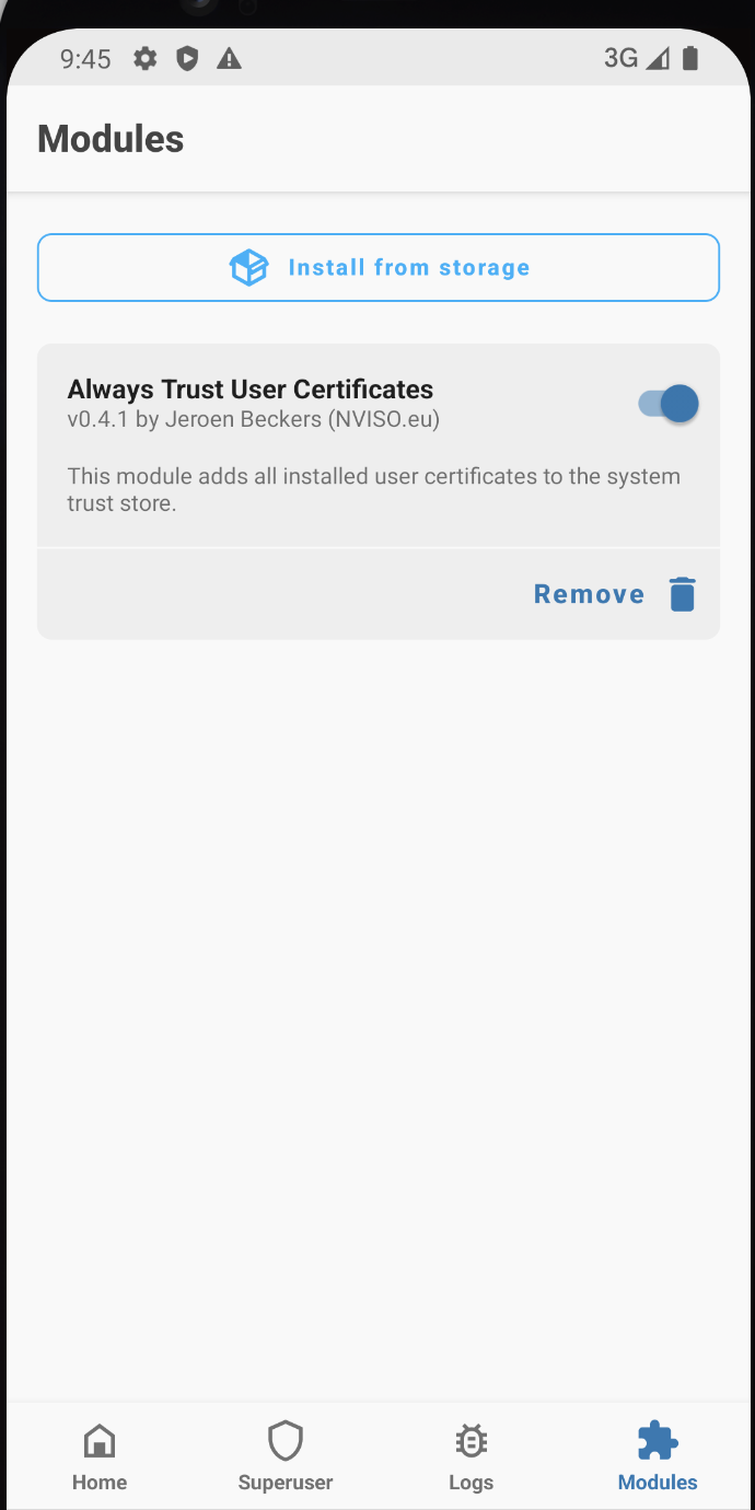 - 使其系统信任:下载 Magisc 模块 MagiskTrustUserCerts(一个 .zip 文件),拖放到手机中,前往手机中的Magics 应用的**