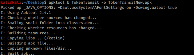 然后保存文件,退出所有目录,并使用以下命令重建apk: apktool b *folder-name/* -o *output-file.apk*