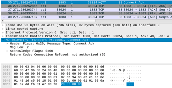 当 MQTT 代理收到 CONNECT 数据包时,会发送回 CONNACK 数据包。该数据包包含一个返回代码,这对于理解连接状态至关重要。返回代码 0x00 表示凭据已被接受,标志着连接成功。另一方面,返回代码 0x05 表示凭据无效,从而阻止连接。
