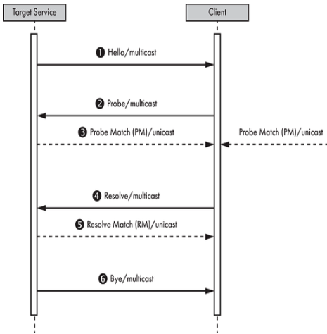 当加入网络时,目标服务通过广播多播 Hello 来宣布其存在。它保持开放状态,以接收来自寻找按类型服务的客户端的多播探测,该类型是端点的唯一标识符(例如,NetworkVideoTransmitter 用于 IP 摄像头)。作为对匹配探测的响应,目标服务可能会发送单播探测匹配。类似地,目标服务可能会接收到旨在通过名称识别服务的多播解析,如果它是目标服务,则可能会回复单播解析匹配。在离开网络时,目标服务尝试广播多播再见,以表示其离开。