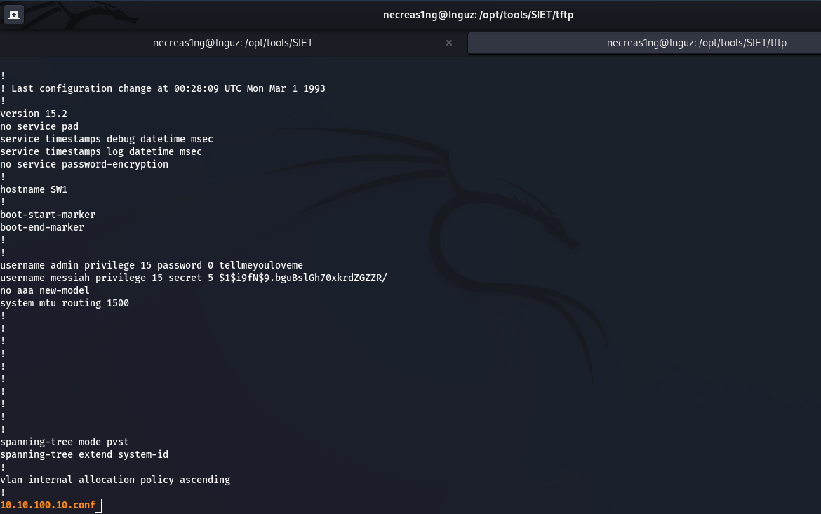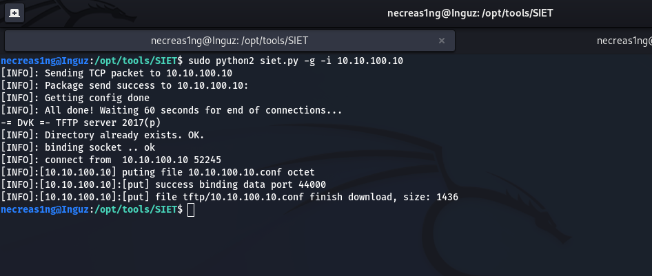 目标交换机的地址是10.10.100.10,CSI处于活动状态。加载SIET并开始攻击。-g参数表示从设备中提取配置,-i参数允许您设置易受攻击目标的IP地址。