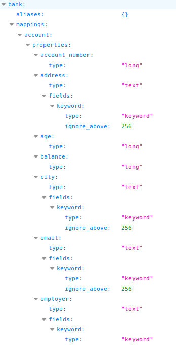 要获取有关索引中保存的数据类型的信息,您可以访问:http://host:9200/<index>,在本例中为http://10.10.10.115:9200/bank