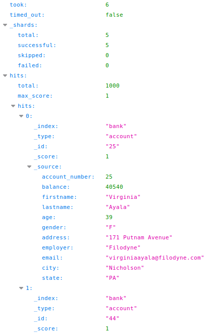 因此,此时您可能会注意到在“hits”中有一个名为“total”的字段,它表示在此索引中找到了1000个文档,但仅检索了10个。这是因为默认情况下限制为10个文档。