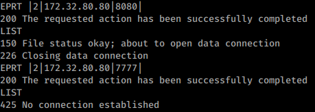LIST(这将仅向连接的 <IP:Port> 发送FTP文件夹中当前文件的列表)并检查可能的响应:150 File status okay(这意味着端口是开放的)或425 No connection established(这意味着端口是关闭的) - 除了