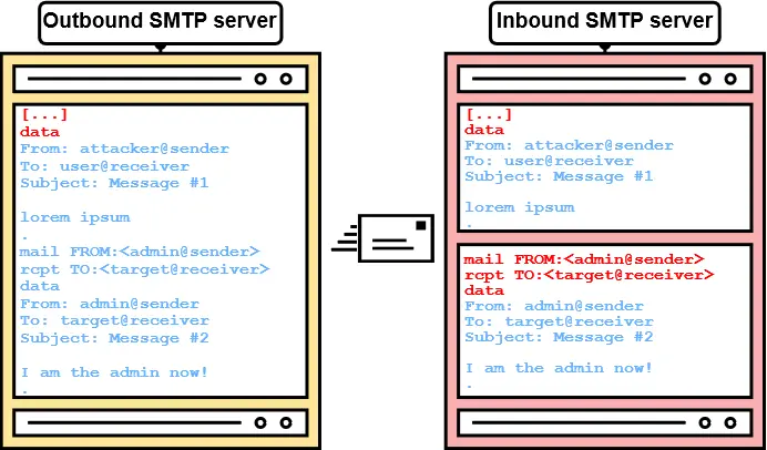 这种类型的漏洞最初是在这篇文章中发现的,文中解释了在最终确定电子邮件时,利用SMTP协议解释中的差异进行攻击是可能的,这允许攻击者在合法邮件的正文中走私更多邮件,从而冒充受影响域的其他用户(例如admin@outlook.com),绕过如SPF等防御措施。