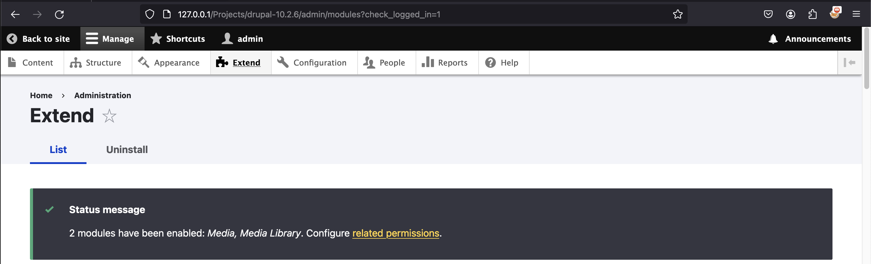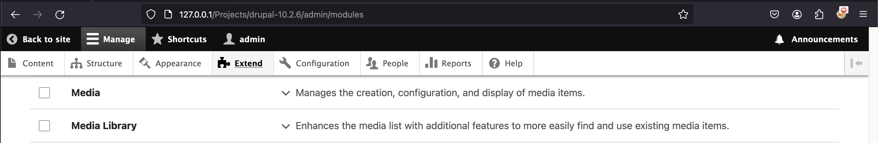 在 Extend 菜单 (/admin/modules) 中,您可以激活看似已经安装的插件。默认情况下,插件 Media 和 Media Library 似乎未被激活,因此让我们激活它们。