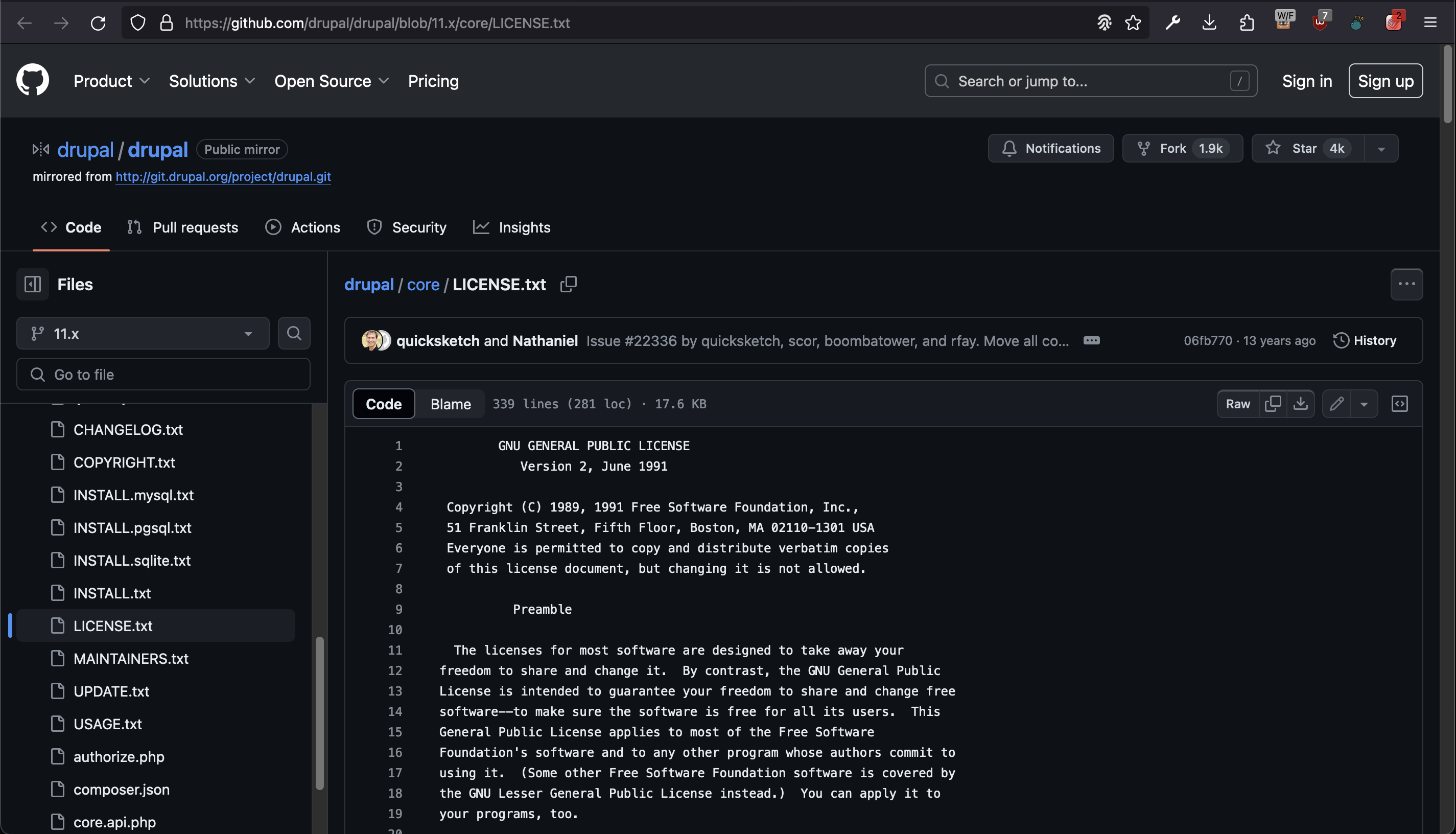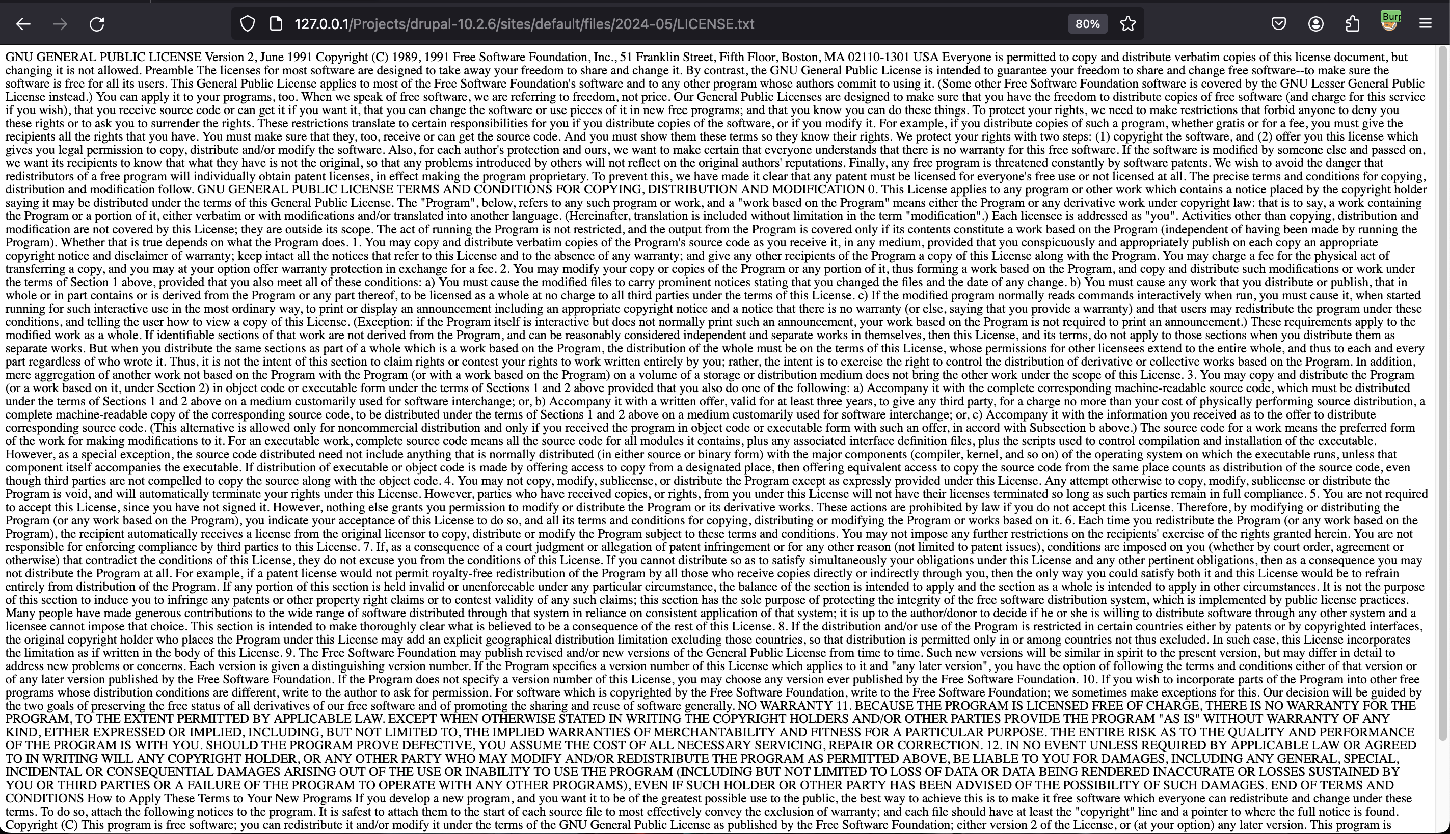 简单来说,如果我们以以下文件为例 core/LICENSE.txt(该文件已经存在于 Drupal 核心中),我们有一个 339 行和 17.6 KB 大小的文件,这非常适合在中间添加一小段 PHP 代码(因为文件足够大)。