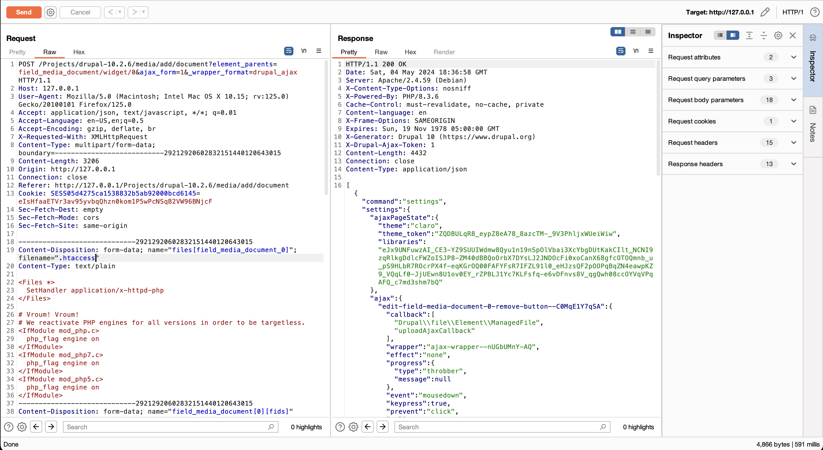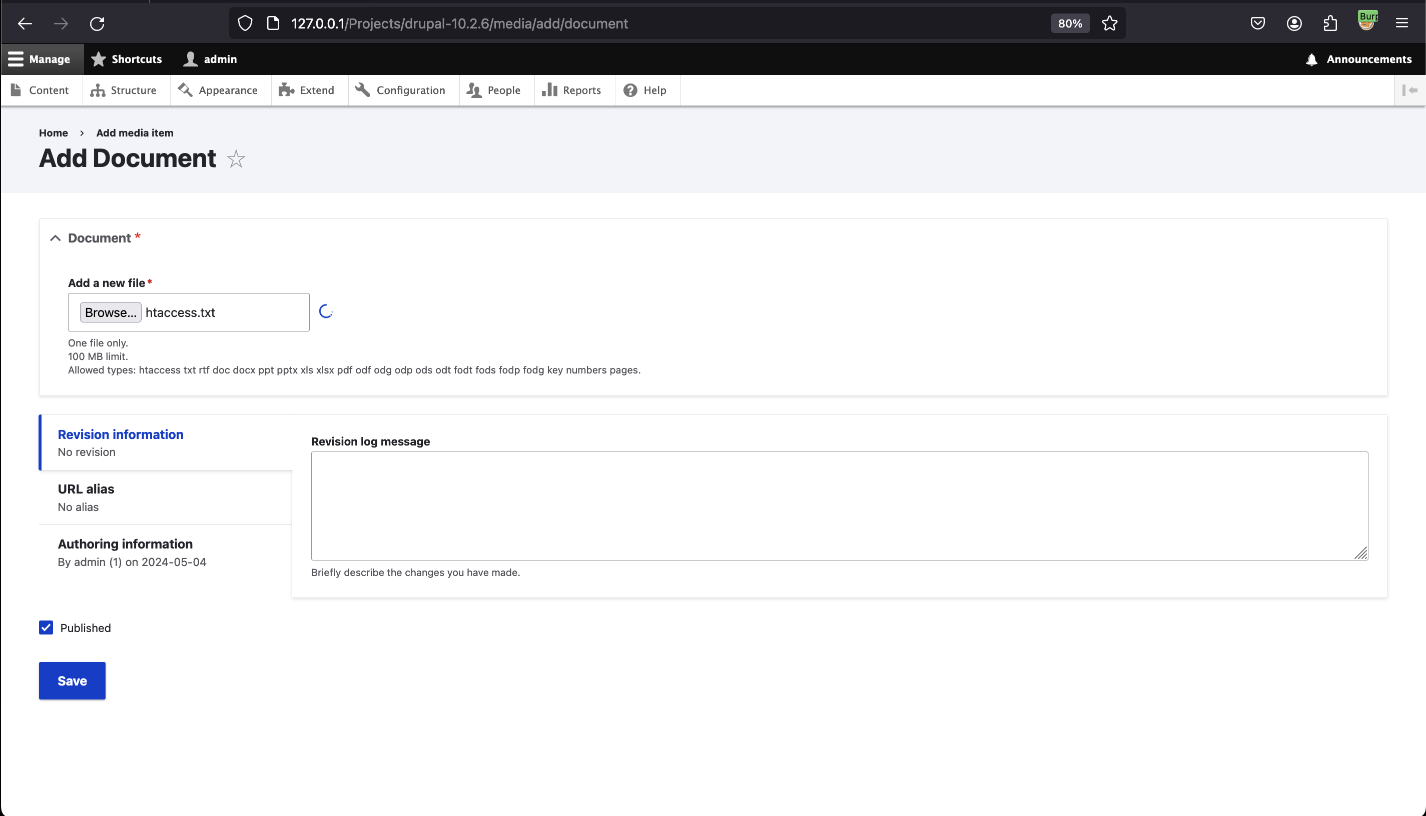 首先,我们利用 Add Document (/media/add/document) 功能上传包含 Apache 指令的文件 (.htaccess)。