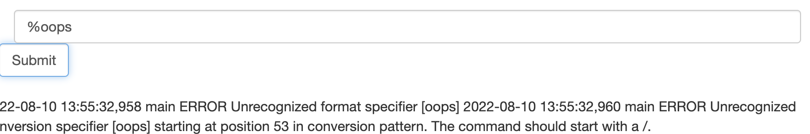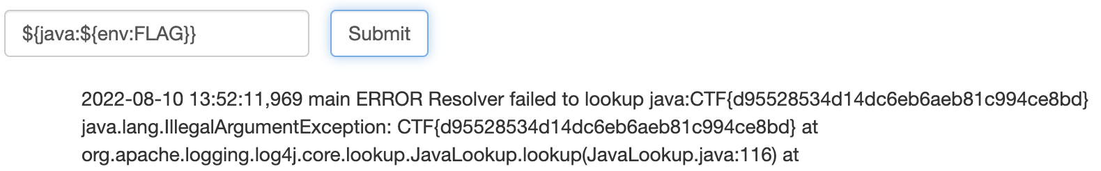 在 CTF 中,你 无法访问 java 应用程序的 stderr,但 Log4J 异常会发送到 stdout,这在 python 应用程序中被打印。这意味着触发异常时我们可以访问内容。提取标志的异常是:${java:${env:FLAG}}。这有效是因为 ${java:CTF{blahblah}} 不存在,异常的值将显示标志:
