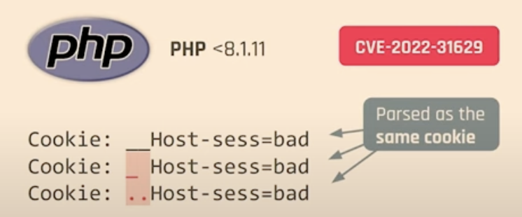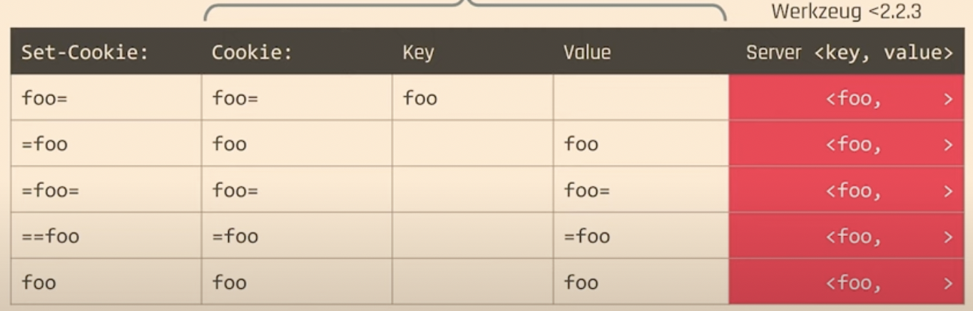 因此,__Host- 前缀 cookie 的保护之一是防止它们被子域覆盖。例如,防止 Cookie Tossing attacks。在演讲 Cookie Crumbles: Unveiling Web Session Integrity Vulnerabilities (paper) 中,展示了可以通过欺骗解析器设置 __HOST- 前缀的 cookie,例如,在开头或结尾添加 "=":