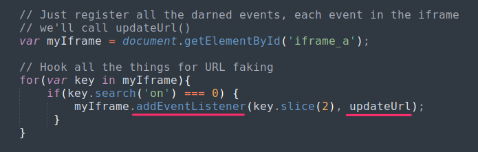 此外,为了使其更真实,可以使用一些 监听器 来检查 iframe 何时更改页面的位置,并用用户认为他正在使用浏览器移动页面的那些位置更新浏览器的 URL。