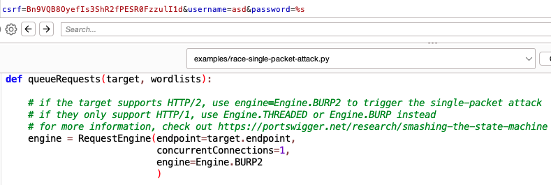 Extensions->Turbo Intruder->Send to Turbo Intruder),您可以在请求中更改要暴力破解的值%s,例如csrf=Bn9VQB8OyefIs3ShR2fPESR0FzzulI1d&username=carlos&password=%s,然后从下拉菜单中选择examples/race-single-packer-attack.py: