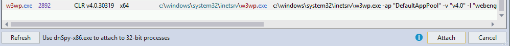 然后选择w3wp.exe以附加到IIS server并点击attach:
