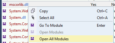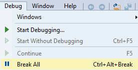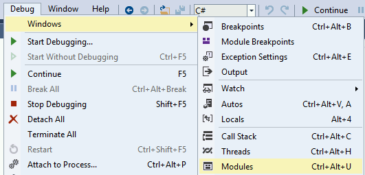 现在我们正在调试该进程,是时候停止它并加载所有模块。首先点击_Debug >> Break All_,然后点击_Debug >> Windows >> Modules_: