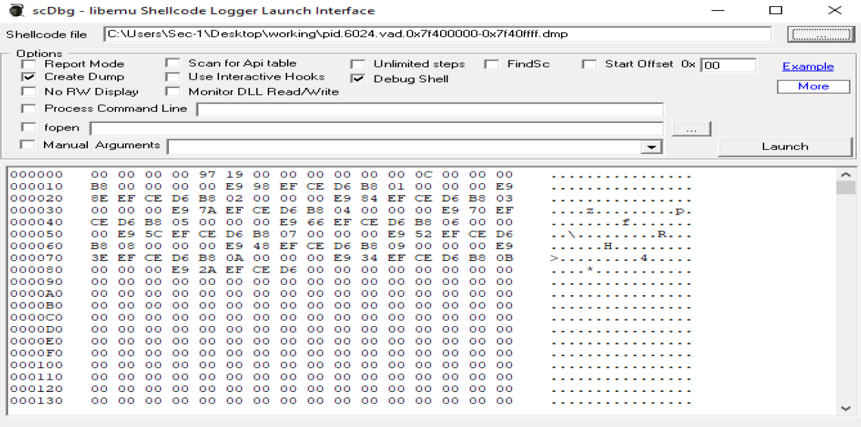 Create Dump 选项将在内存中对 shellcode 进行动态更改时转储最终的 shellcode(用于下载解码后的 shellcode)。start offset 可以用于在特定偏移量处启动 shellcode。Debug Shell 选项对于使用 scDbg 终端调试 shellcode 很有用(然而,我发现之前解释的任何选项在这方面更好,因为您可以使用 Ida 或 x64dbg)。