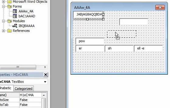 使用GetObject函数可以从宏的表单中获取数据。这可以用来增加分析的难度。以下是一个宏表单的照片,用于在文本框内隐藏数据(一个文本框可以隐藏其他文本框):