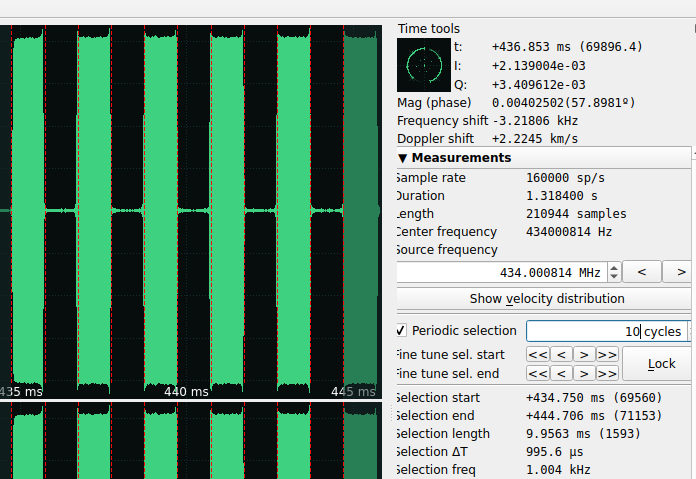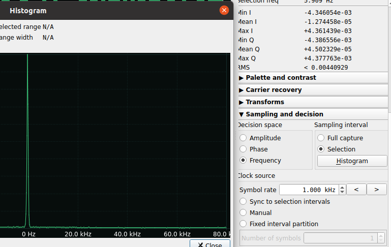 您还可以指示要选择的符号数量,SigDigger将计算1个符号的频率(选择的符号越多,可能越好)。在这种情况下,我选择了10个符号,“选择频率”为1.004 Khz: