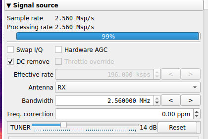 - SigDigger的调谐器有助于捕获更好的信号(但也可能会降低信号质量)。理想情况下,从0开始,继续增大,直到您发现引入的噪声大于您所需的信号改善。