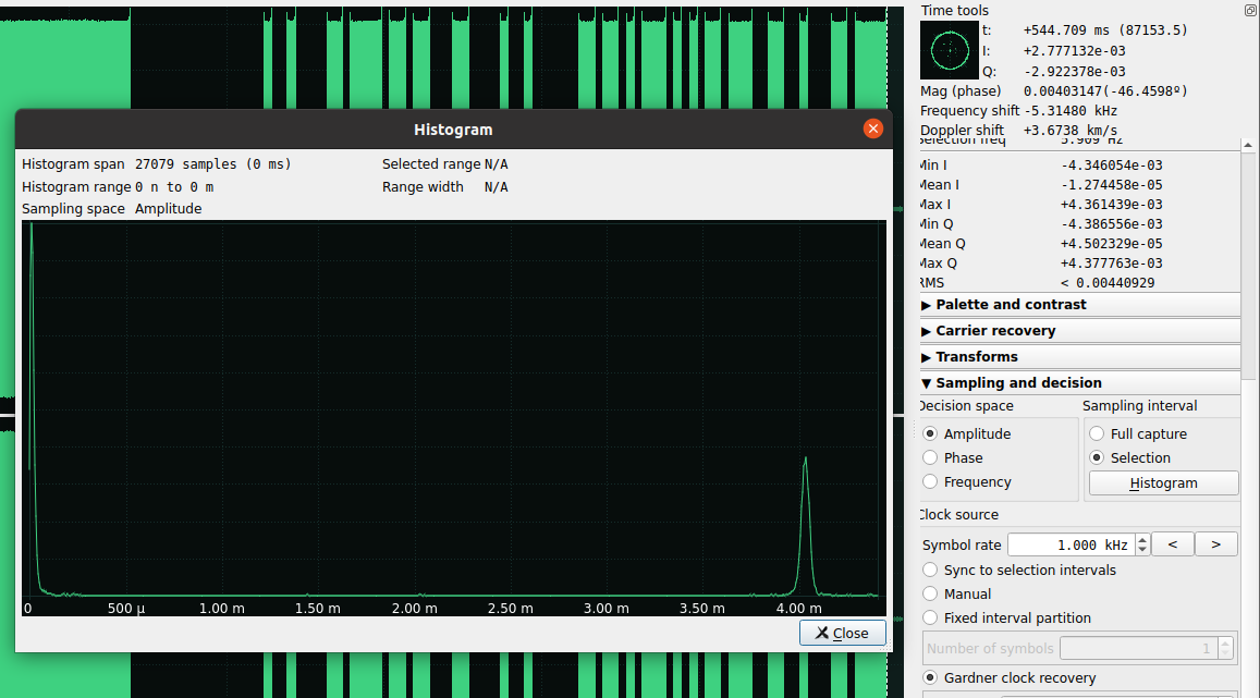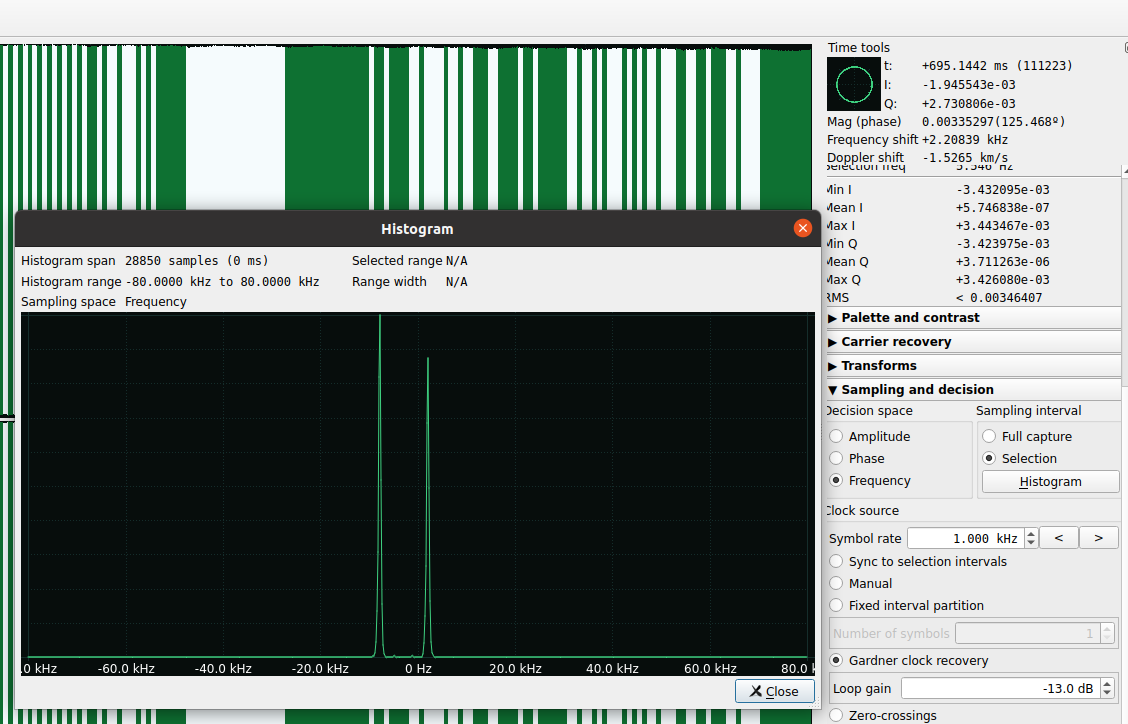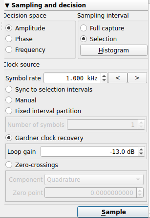发现这是一个AM调制信号和符号率(并且知道在这种情况下某个上意味着1,某个下意味着0),很容易获取信号中编码的比特。因此,选择包含信息的信号并配置采样和决策,然后按下采样(检查幅度已选择,发现的符号率已配置,Gadner时钟恢复已选择):