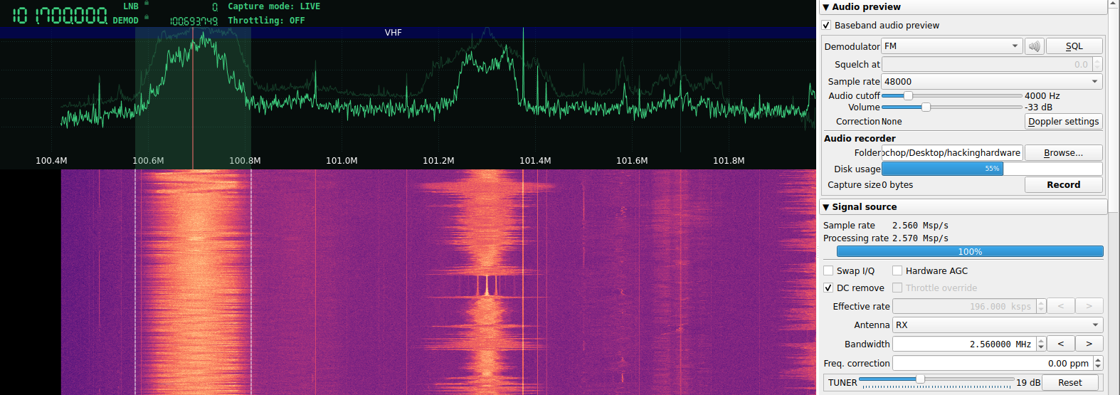 使用SigDigger 与您想要收听的频道同步,配置“基带音频预览”选项,配置带宽以获取所有发送的信息,然后将调谐器设置到噪声真正开始增加之前的水平: