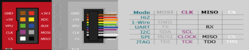 请注意,即使 Pirate Bus 的引脚图指示用于连接 SPI 的 MOSI 和 MISO 引脚,某些 SPI 可能将引脚标记为 DI 和 DO。MOSI -> DI, MISO -> DO
