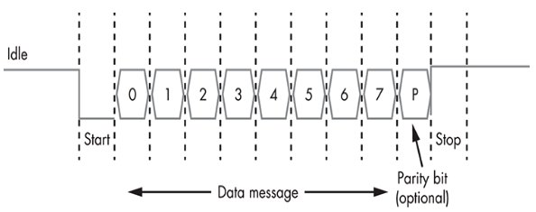 通常,在UART处于空闲状态时,线路保持高电平(逻辑1值)。然后,为了信号数据传输的开始,发射器向接收器发送一个起始位,此时信号保持低电平(逻辑0值)。接下来,发射器发送五到八个数据位,包含实际消息,后面跟着一个可选的奇偶校验位和一个或两个停止位(逻辑1值),具体取决于配置。用于错误检查的奇偶校验位在实际中很少见。停止位(或位)表示传输结束。