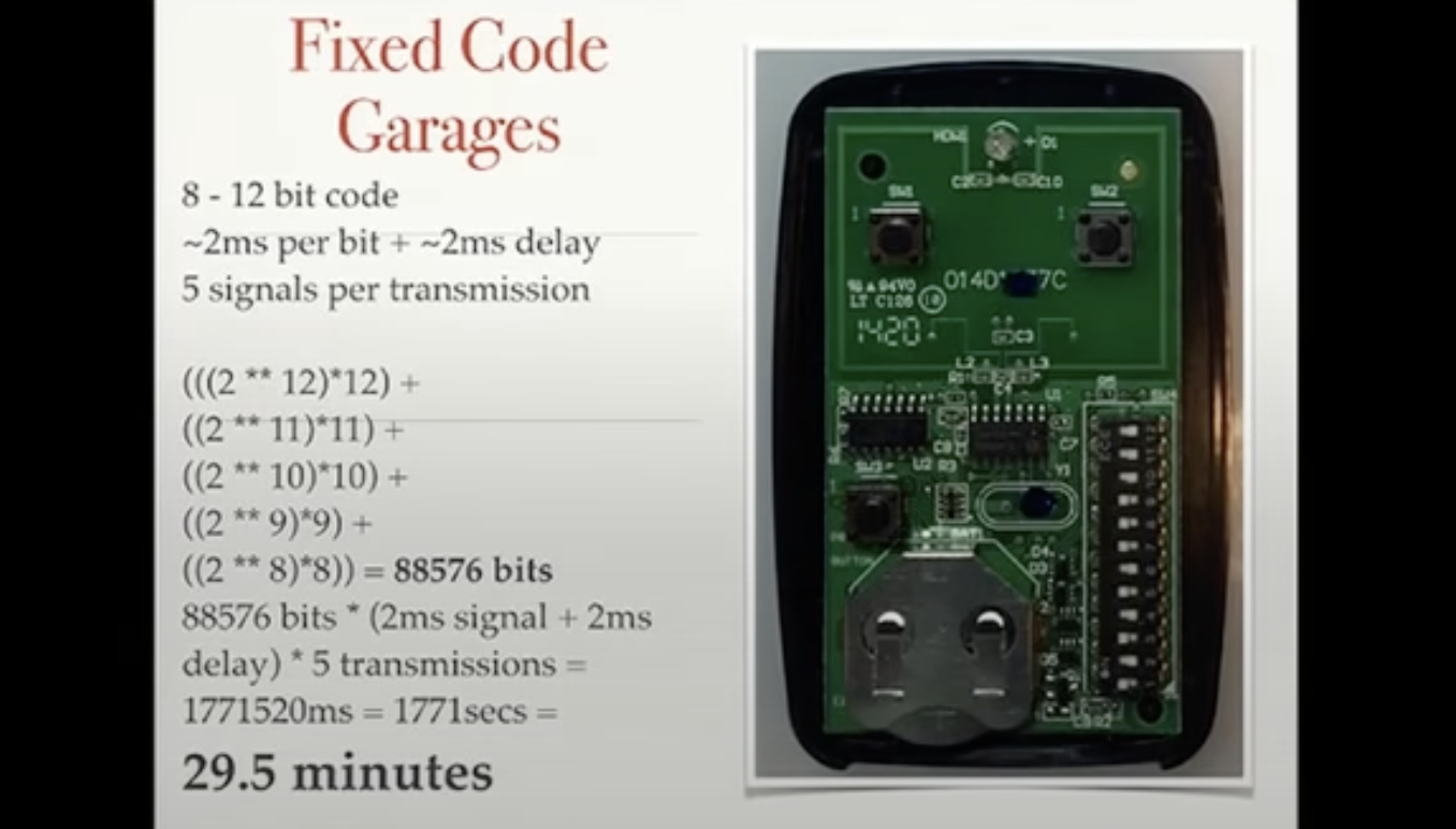 有人可以使用称为代码抓取器的设备来拦截RF信号并记录以备后用。这被称为重放攻击。为了防止这种攻击,许多现代车库门开启器使用一种更安全的加密方法,称为滚动代码系统。