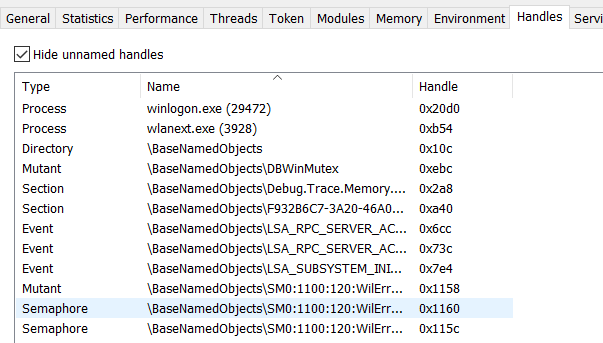 Process Hacker是一个可以免费下载的工具。它有几个出色的选项来检查进程,其中之一是查看每个进程的句柄的能力。